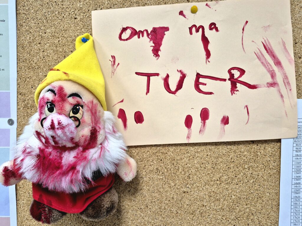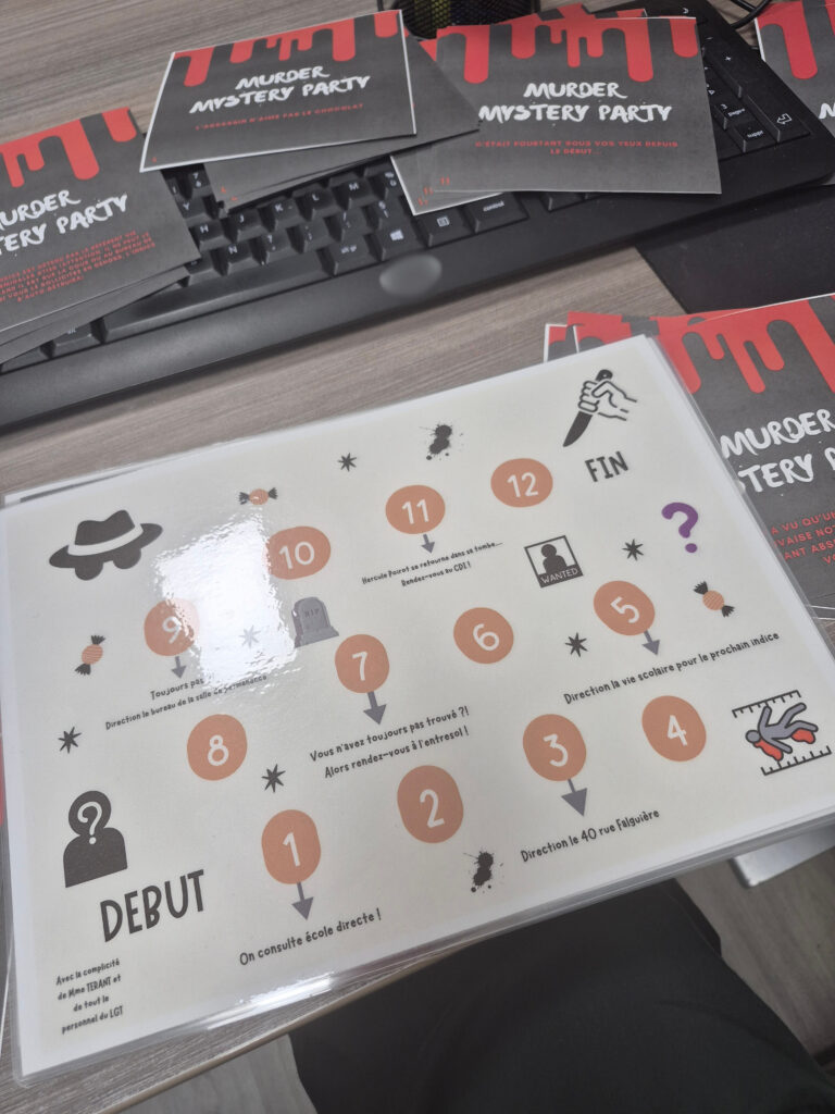 Bravo à Maxime, Matthieu, Victor et Sandile en Terminale Générale qui ont découvert le pot-aux-roses en 1er et qui ont ainsi remporté le gros lot ! Ensuite Corentin en TAC, Macha et Dunja en TRH, Judith en TEE et, enfin, Victoire et Bérénice en 2nde4 ont également réussi à remonter jusqu’à notre terrible meurtrière !